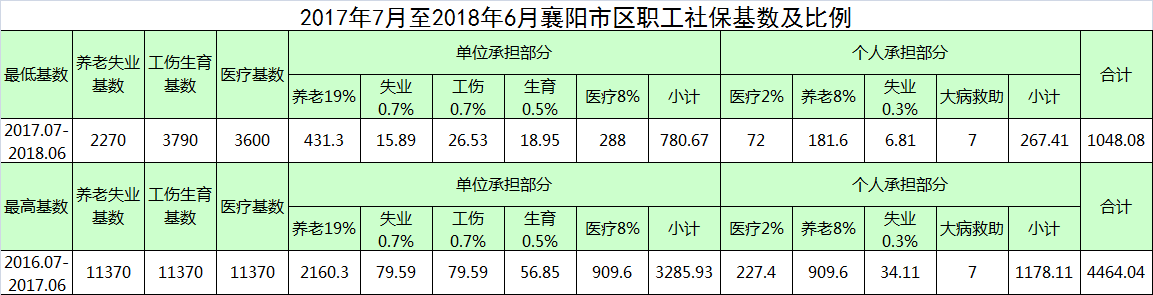 :1、個人基數(shù)以員工本人上年月均工資為基礎(chǔ),十舍五入保留至十元位,但不得高于2015年度襄陽市社平月工資3560元的300%,養(yǎng)老保險和失業(yè)保險基數(shù)不得低于社平工資的60%,工傷保險和失業(yè)保險基數(shù)按社平工資3790計算,醫(yī)療險基數(shù)按社平工資的95%。